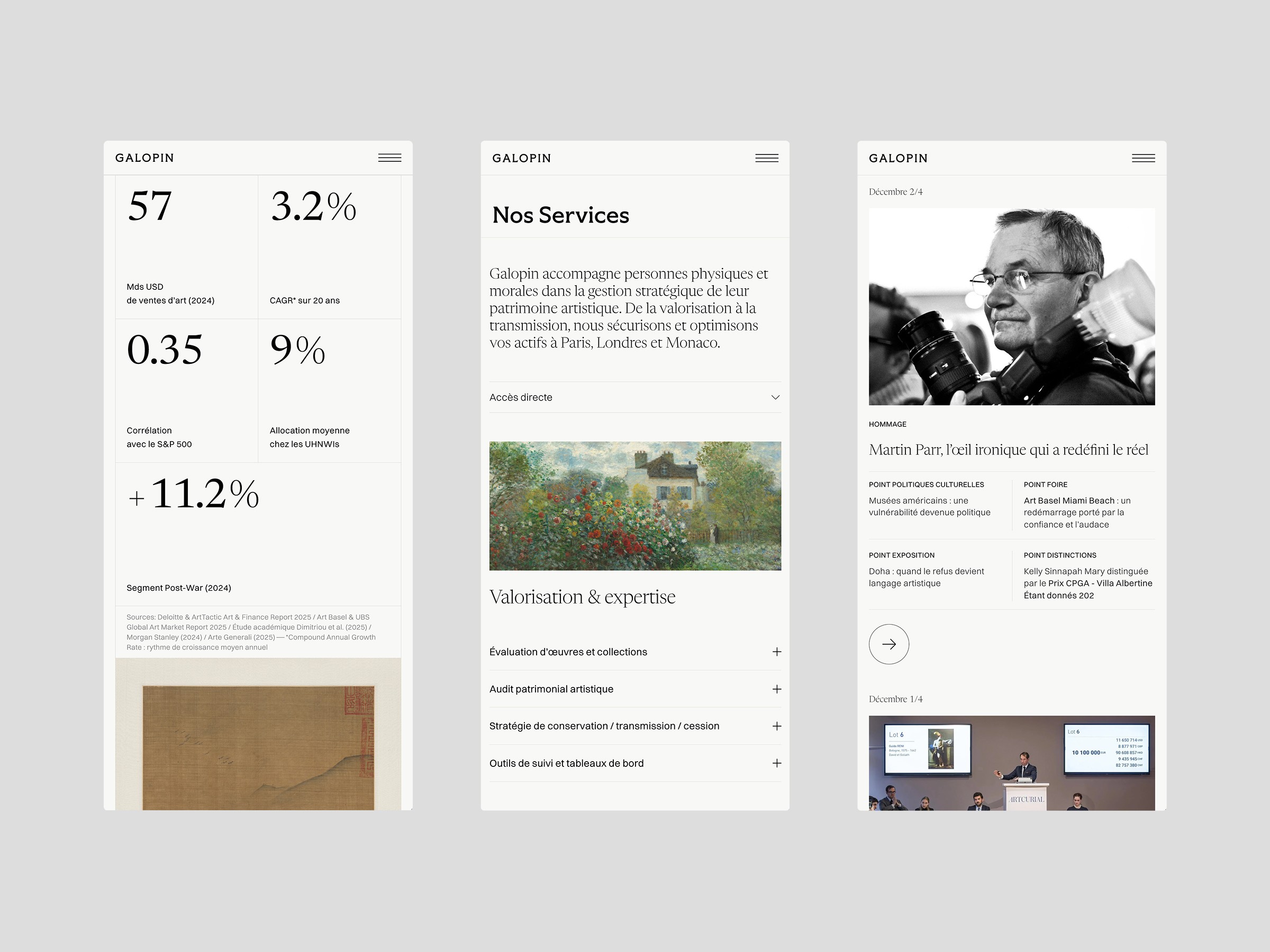 Working with Galopin, an art advisory firm (Paris, London, Monaco), on a complete overhaul of its digital identity. The challenge: Refresh the identity, to create a fluid, interactive platform optimized for mobile viewing, reflecting the exclusivity of their services.