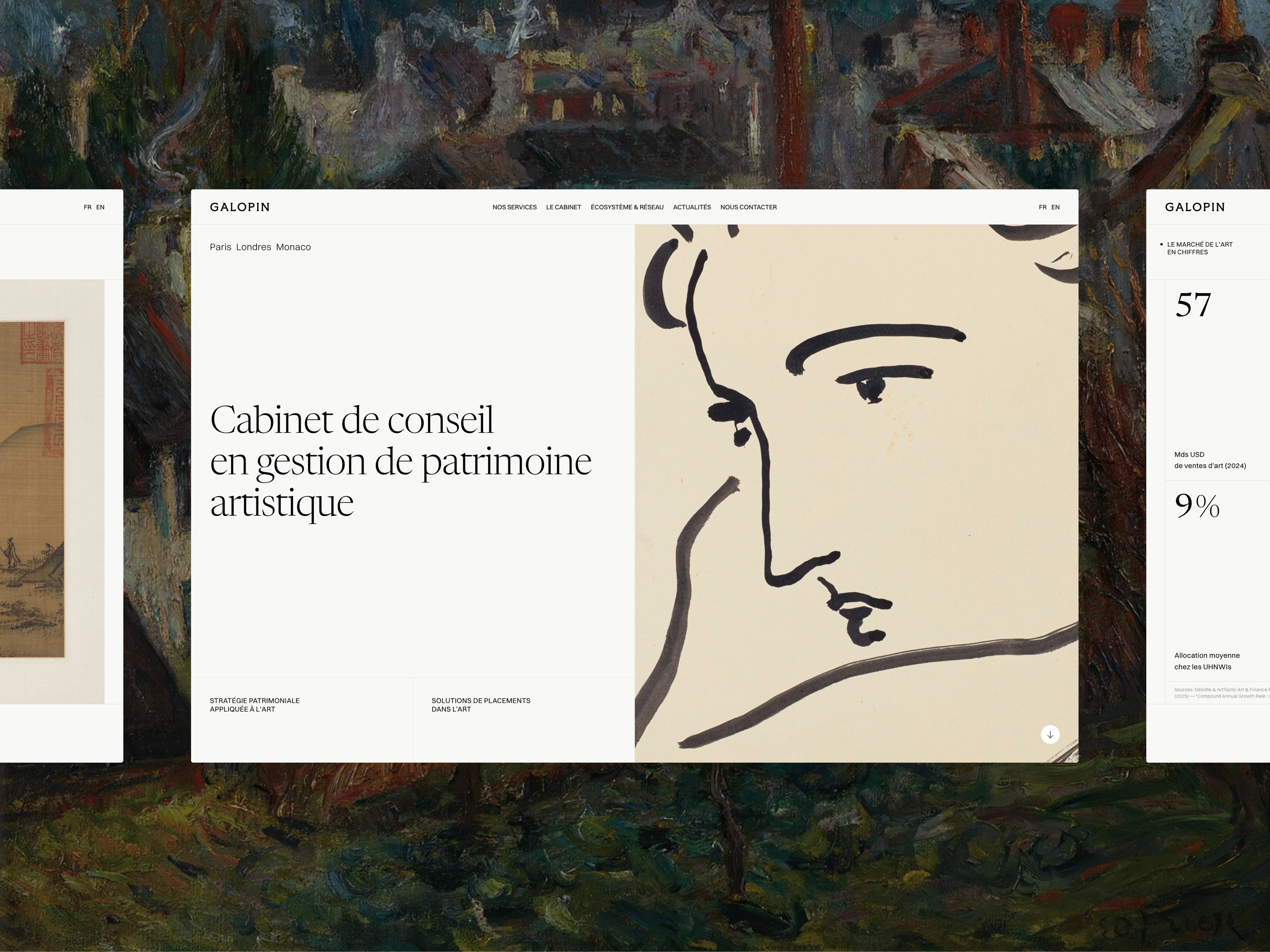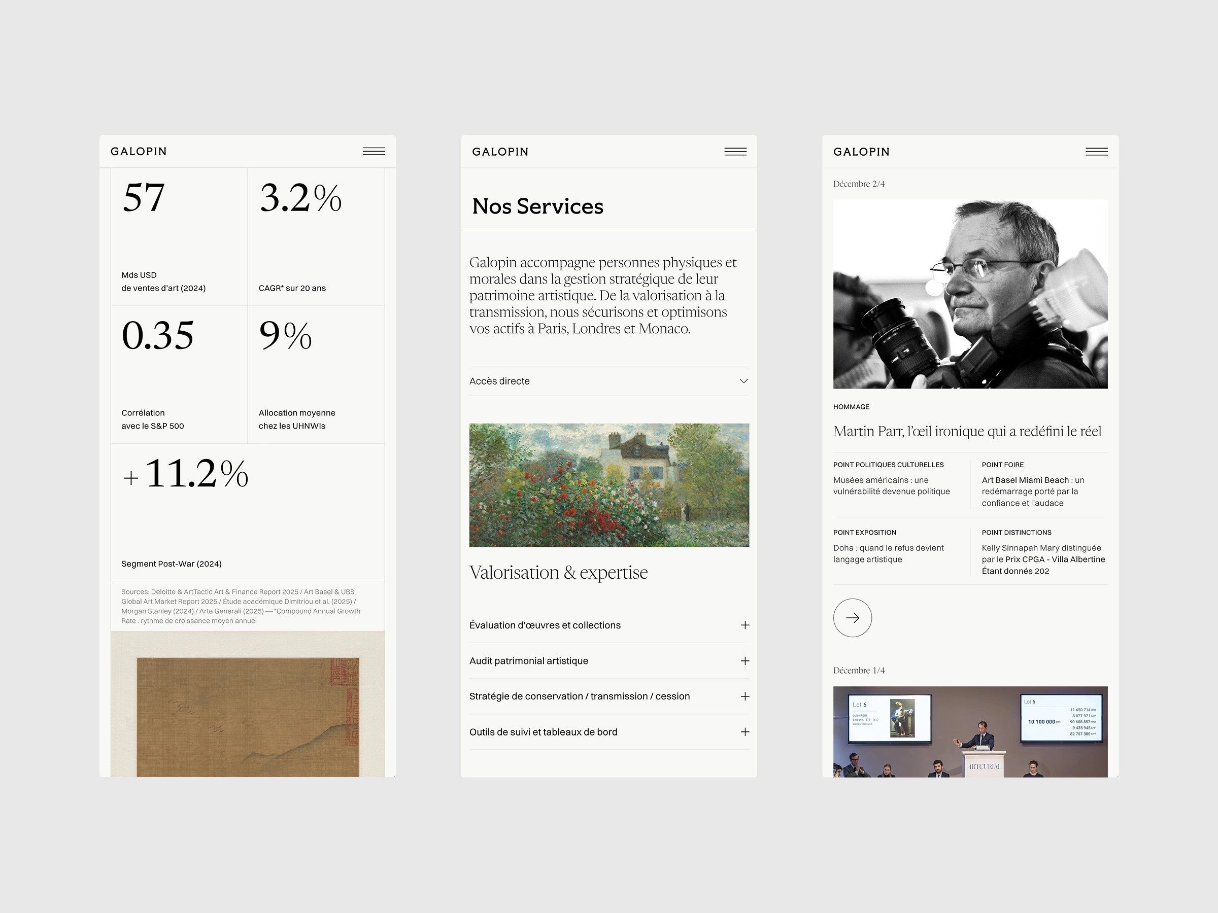 Working with Galopin, an art advisory firm (Paris, London, Monaco), on a complete overhaul of its digital identity. The challenge: Refresh the identity, to create a fluid, interactive platform optimized for mobile viewing, reflecting the exclusivity of their services.